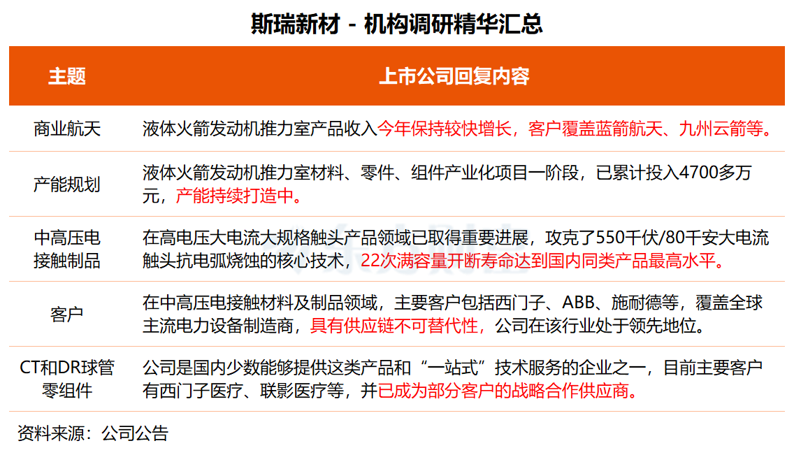 华龙证券此前研报指出,随着我国商业航天产业化加速落地,斯瑞新材作为蓝箭航天核心供应商,有望直接受益,相关业务维持高速增长。
