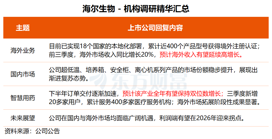 据海尔生物介绍,三季度新增陕西省人民医院等20多家用户,累计服务400多家医疗服务机构;在海外市场拓展方面,也取得显著的阶段性成果。“下半年订单交付逐渐加速,预计该产业全年有望保持双位数增长。”