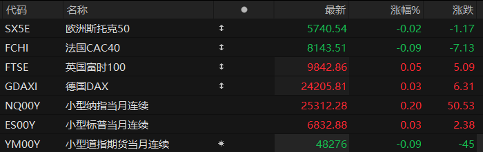 周五盘前,美股三大股指期货震荡盘整,欧洲主要指数涨跌不一。截至发稿,纳斯达克100指数期货涨0.20%,标普500指数期货涨0.03%,道指期货跌0.09%。