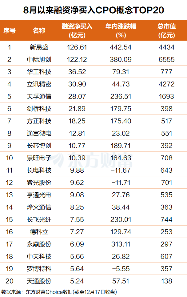 东方财富Choice数据显示,8月以来,杠杆资金抢筹CPO概念股,融资净买额排名前20个股合计总金额高达493亿元。