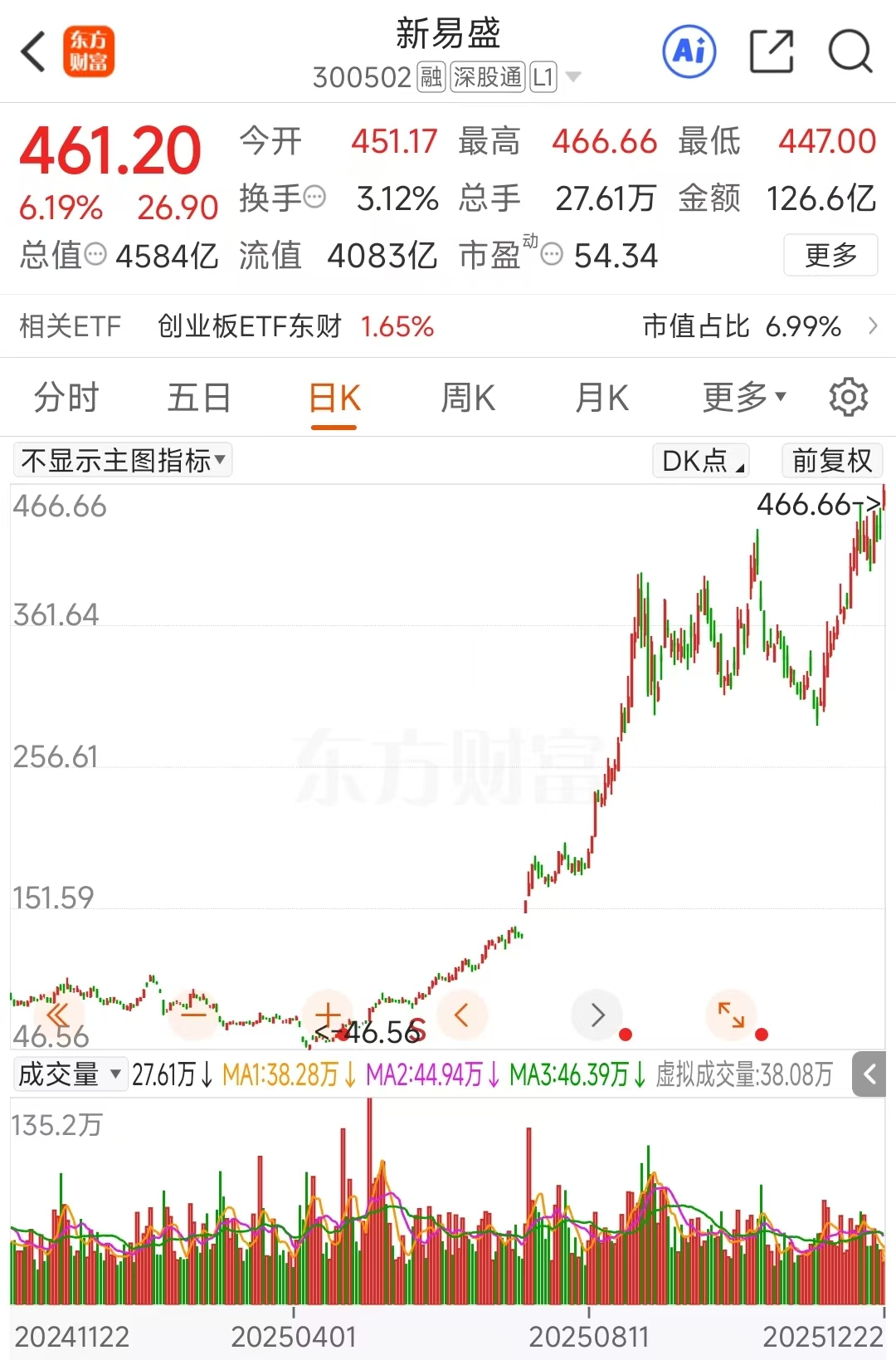 尤其新易盛,早盘一度大涨超7%,刷出466.66元的历史新高价,这和4月9日盘中触及的46.56元相比,年内已完成股价十倍的壮举。