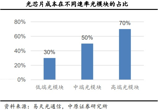 资料显示,光芯片是光模块的核心上游组件,承担光电/电光转换的核心功能,其性能直接决定光模块的速率、功耗与稳定性。中原证券表示,光芯片在不同速率光模块的成本占比通常在30%-70%,而越高速、越高端的光模块,光芯片的成本占比就越高。