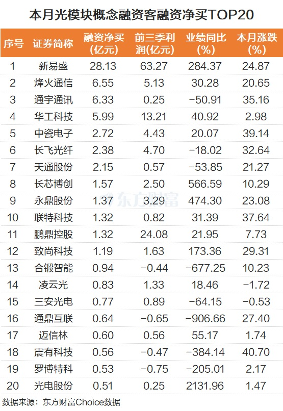从个股角度来看,本月光模块概念也颇受杠杆资金青睐。东方财富Choice数据显示,按个股融资净买入额相加,光模块板块本月被融资净流入44.61亿元。