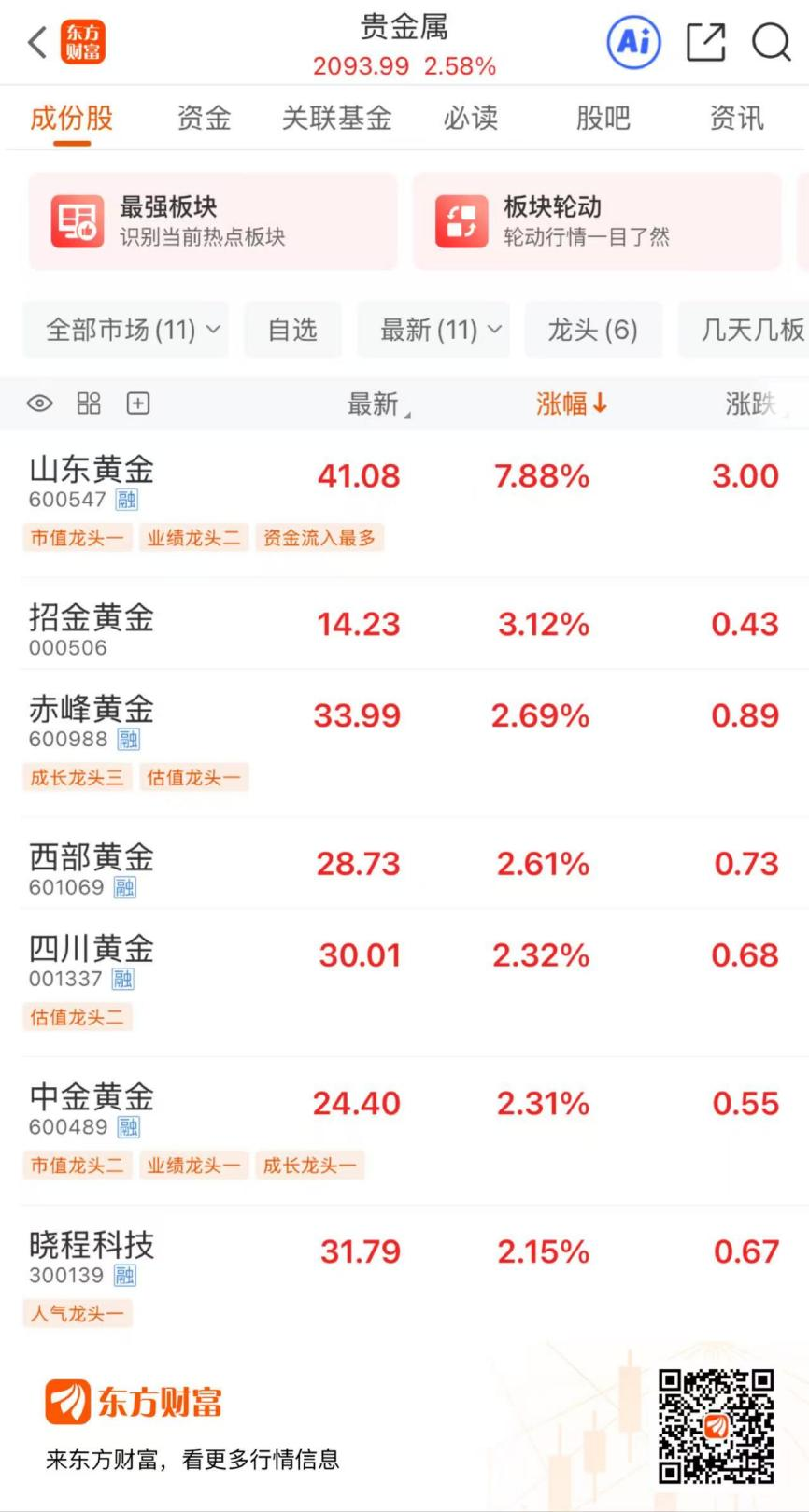 12月23日,贵金属板块高开高走,涨幅居两市行业板块前列。截至早间收盘,贵金属板块上涨2.58%,个股方面,山东黄金大涨近8%,招金黄金涨超3%,赤峰黄金、西部黄金、四川黄金、中金黄金、晓程科技等多股涨超2%。