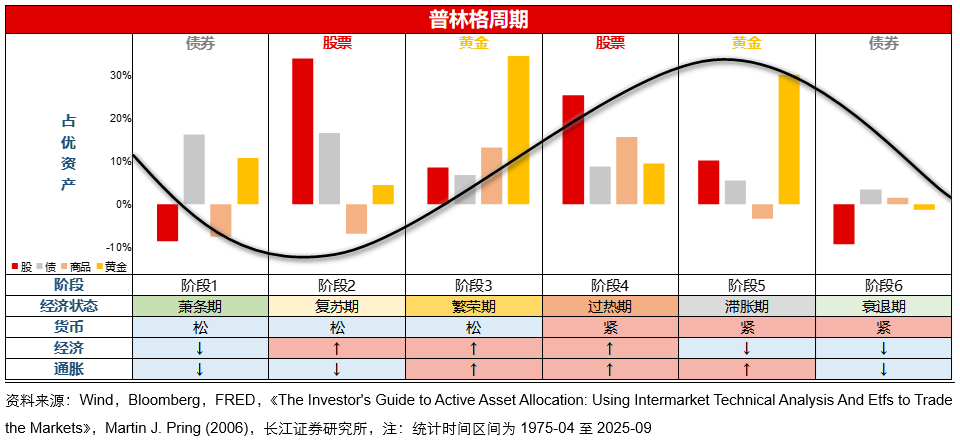 展望未来,黄金仍将是表现占优的资产之一。首先,支撑黄金的底层逻辑并未改变,美元信用体系面临结构性挑战等核心驱动力依然存在。其次,从普林格周期视角看,美国经济明年或将进入复苏或繁荣周期,在“经济扩张+通胀预期抬升+货币宽松”的组合下,黄金在资产组合中的战略地位进一步强化。