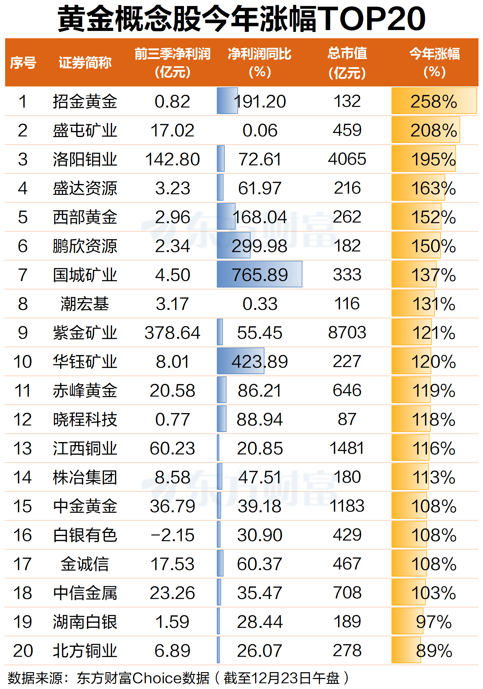 A股方面,在今年国际金价不断走高的带动下,A股黄金概念股集体走高。截至12月23日早间收盘,A股70只黄金概念股今年累计涨跌幅中位数高达51.6%,其中招金黄金、盛屯矿业、洛阳钼业、盛达资源、西部黄金、鹏欣资源等18股今年股价翻倍。