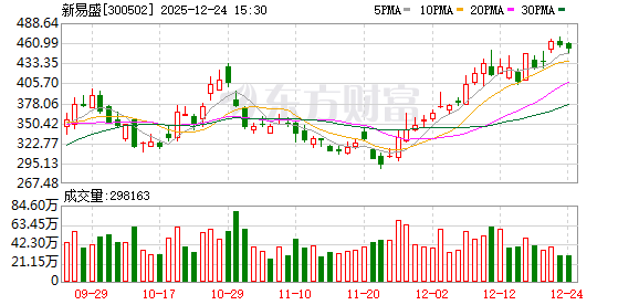 近1个月以来,新易盛股价维持涨势,并于12月17日成功突破前高,今日股价则再创历史新高,最高触及466.66元,较4月9日录得的年内最低点46.56元相比,累计涨幅已超9倍,跻身A股市场年内“10倍股”行列。从量能数据上看,新易盛自11月14日以来至今的27个交易日期间,每日成交额均在100亿元以上,资金活跃度持续高涨。