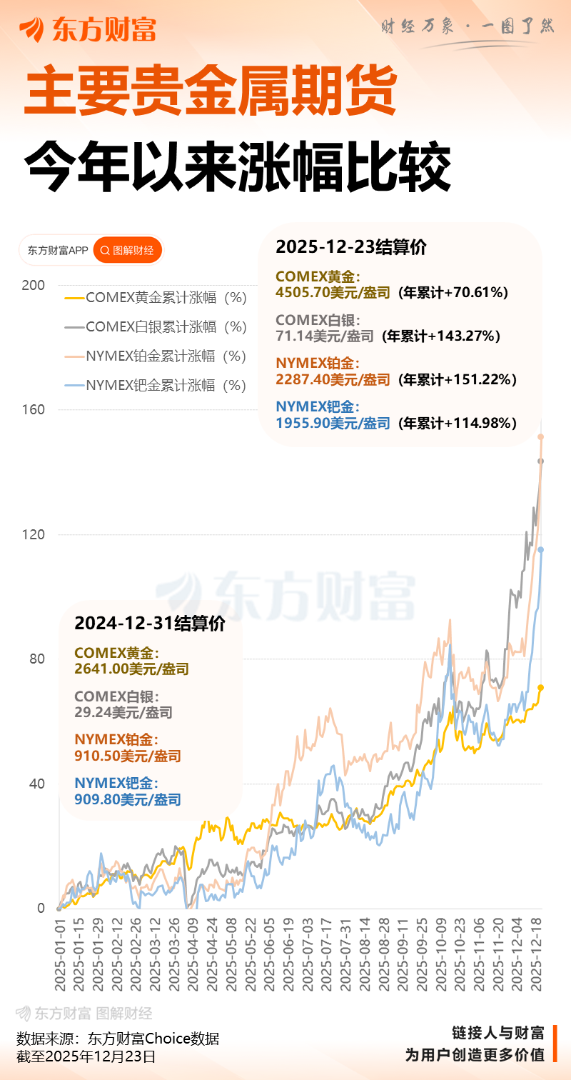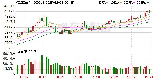 12月24日,现货黄金继续拉升,盘中最高触及4525.70美元/盎司,再创历史新高,截至发稿稍有回落,报4498.36美元/盎司。数据显示,现货黄金价格年内上涨了约1880美元/盎司,涨幅超过70%。