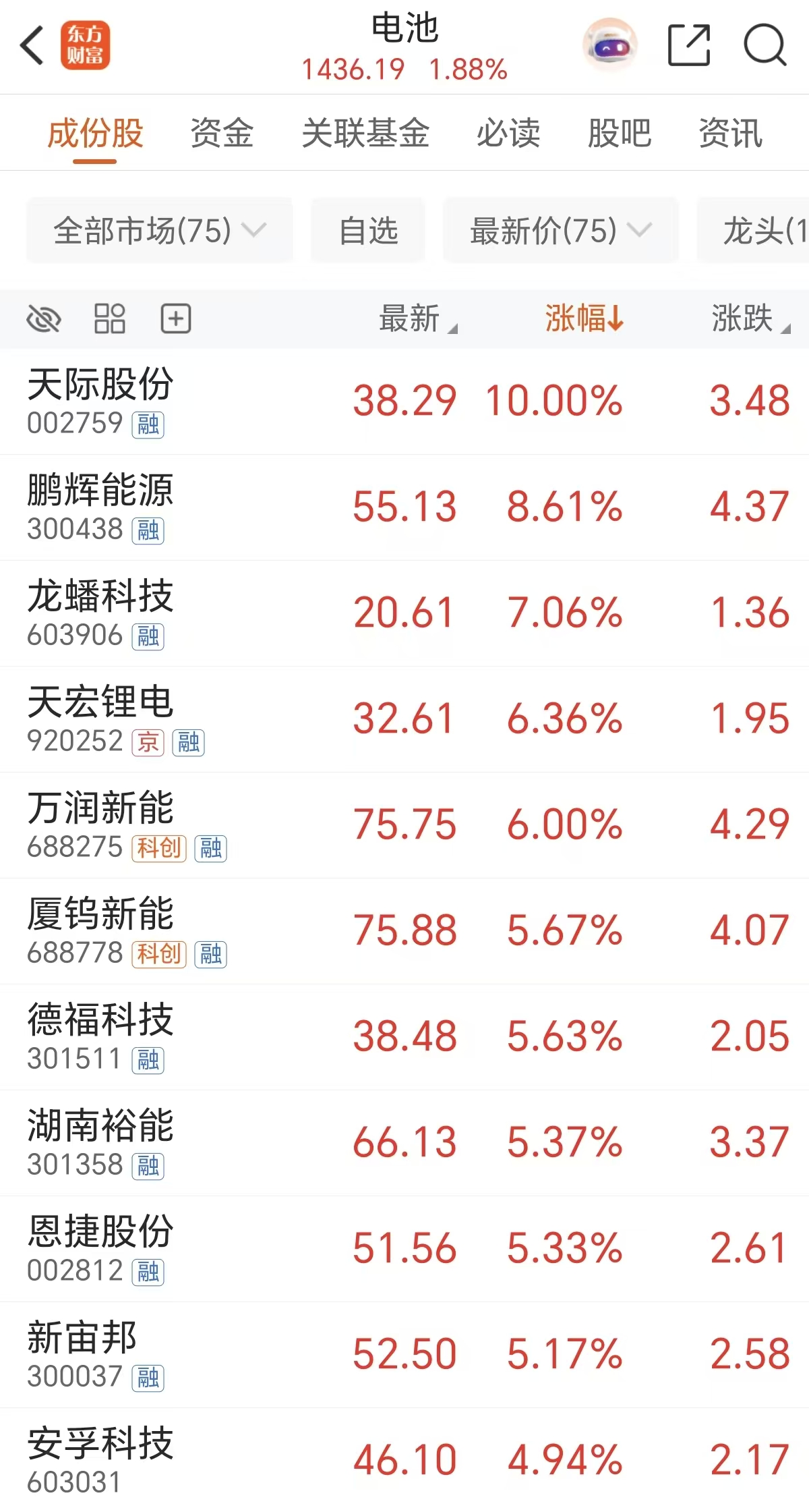 周二(12月23日)锂电池板块表现强势,天际股份涨停,鹏辉能源涨近9%,龙蟠科技涨超7%,天宏锂电涨超6%,万润新能涨6%。