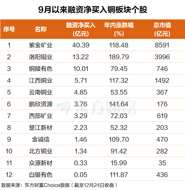 东方财富Choice数据显示,自今年9月以来,杠杆资金净买入多只铜板块个股,总金额近87亿元。