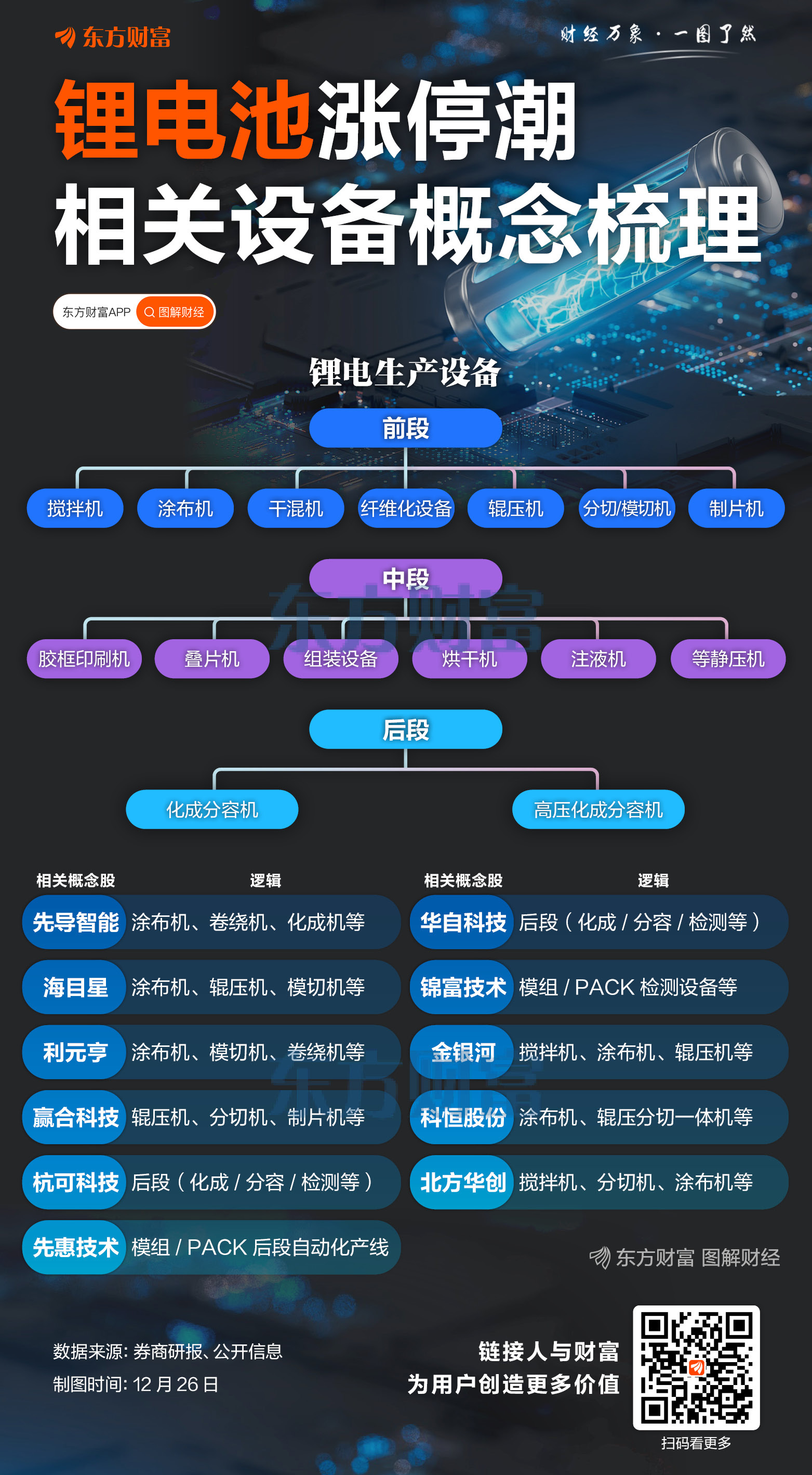 在这样的背景下,锂电池生产相关设备,就成了市场关注的焦点。有机构表示,锂电池生产设备可以分为前段(搅拌机、涂布机、干混机等)、中段(叠片机、注液机、烘干机等)、后段(化成分容机等)设备。