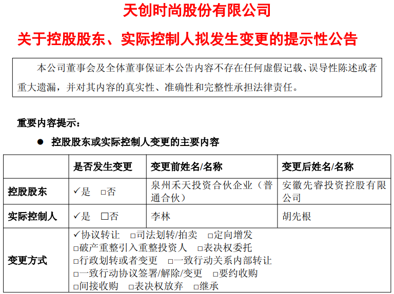 12月26日晚间,天创时尚(603608)发布关于控股股东、实际控制人拟发生变更的提示性公告。公司控股股东将由泉州禾天投资合伙企业(普通合伙)(以下简称“泉州禾天”)变更为安徽先睿投资控股有限公司(以下简称“安徽先睿”),公司实际控制人将由李林变更为胡先根。公司股票将于2025年12月29日开市起复牌。