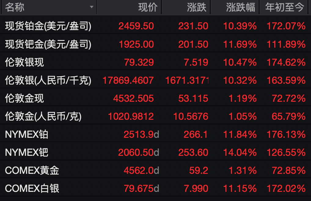 白银暴涨10%,最高至79.405美元/盎司,年内涨幅超170%;现货黄金触及4549美元/盎司,刷新历史高位;NYMEX铂收涨11.84%,创历史新高……
