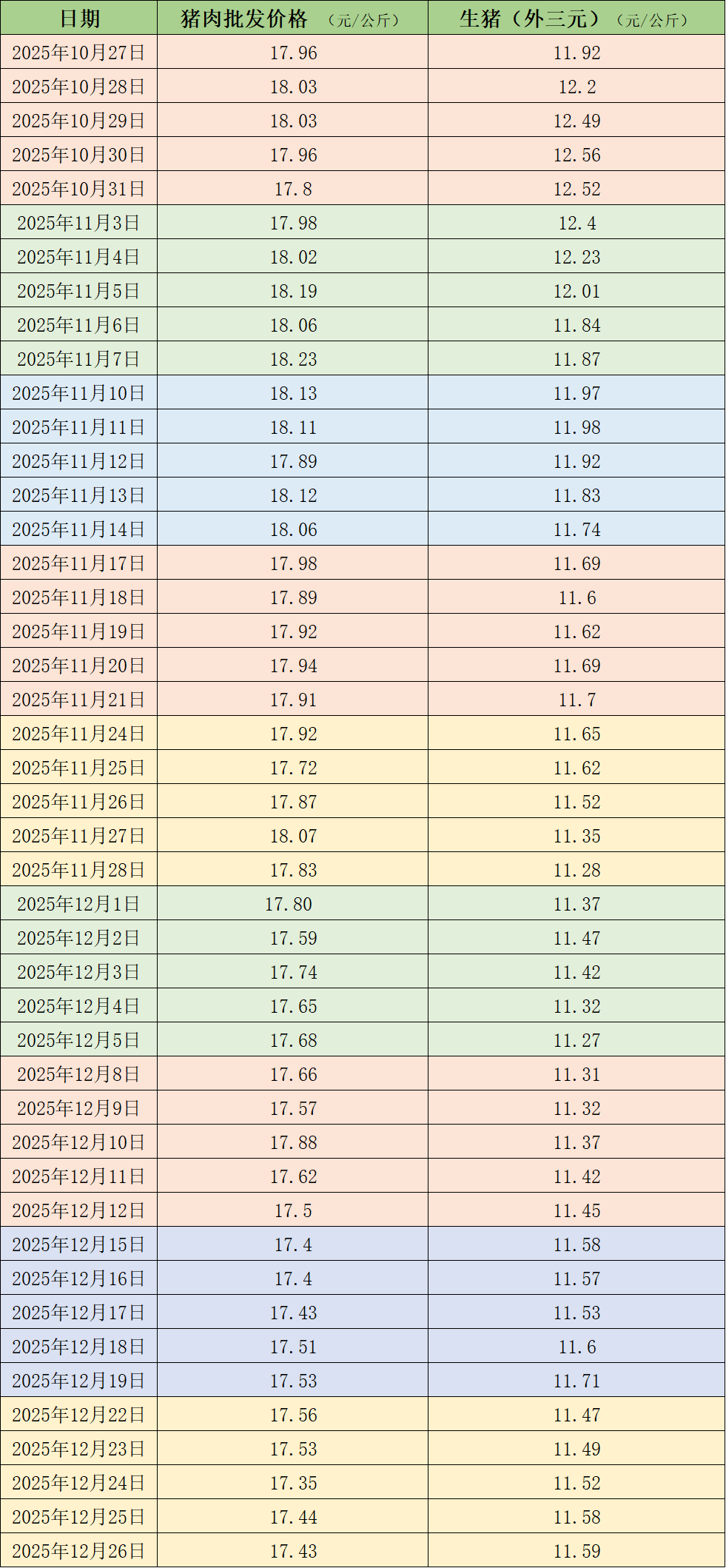 本周国内生猪周均价环比微跌。据中国养猪网的数据,12月26日,生猪(外三元)价格为11.59元/公斤,与上周五(12月19日)的11.71元/公斤相比,下降1%。从一周均价来看,本周生猪均价为11.53元/公斤,与上周11.6元/公斤的均价相比,下降0.6%。