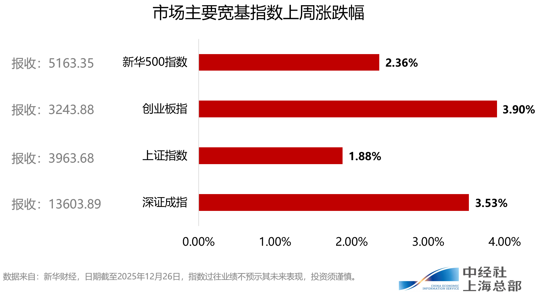 本周(12月22日至12月26日)A股市场主要宽基指数悉数上涨。其中,上证指数周度上涨1.88%;深证成指周度上涨3.53%;创业板指周度上涨3.90%;新华500指数周度上涨2.36%。