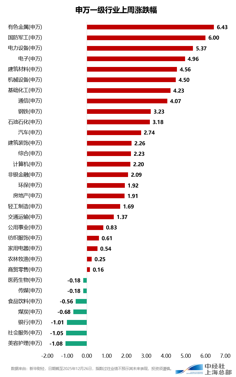 从申万一级行业来看,本周行业指数涨多跌少,有色金属、国防军工、电力设备、电子和建筑材料等行业指数涨幅居前,美容护理、社会服务、银行等行业指数跌幅靠前。