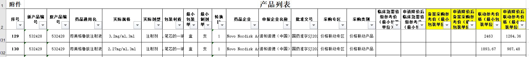 另外,在今日四川省药械招采中心挂出一批药品降价清单中,减重版本“诺和盈”司美格鲁肽出现了大幅降价,司美格鲁肽注射液2.27mg/ml×3ml规格价格从1893.67元降到987.48元,3.2mg/ml×3ml规格从2463元降至1284.36元。而在近日云南药品招采中心发布的药品降价清单当中,减重版本“诺和盈”司美格鲁肽亦出现了同样价格变动。
