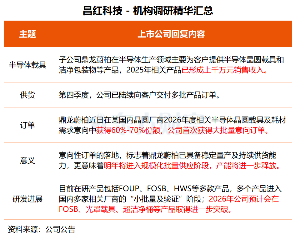 在调研中,昌红科技表示,子公司鼎龙蔚柏自2024年通过客户验证并获小批量订单后,期间持续根据客户的订单情况进行产品交付,2025年相关产品已形成上千万元销售收入。“2026年,公司预计会在FOSB、光罩载具、超洁净桶等产品取得进一步突破。”