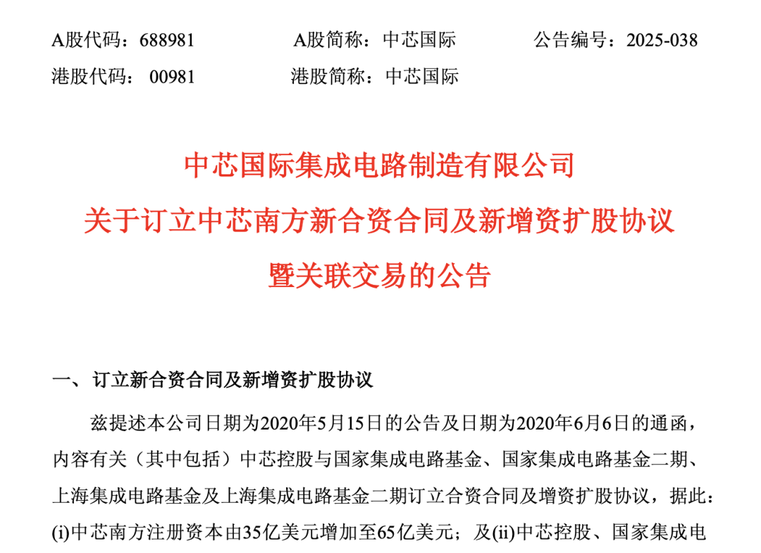 12月29日,中芯国际全资子公司中芯控股与国家集成电路基金、国家集成电路基金二期、国家集成电路基金三期、上海集成电路基金、上海集成电路基金二期、泰新鼎吉及先导集成电路基金订立新合资合同及新增资扩股协议,以修订前合资合同。