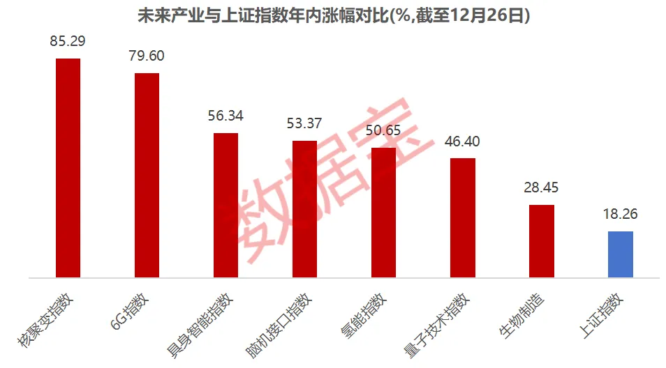 从市场表现来看,今年以来,未来产业备受资金青睐,上述7个未来产业年内均大幅跑赢市场。以万得产业指数来看,截至12月26日,核聚变指数年涨幅超过85%,第六代移动通信指数(6G指数)年涨幅接近80%,具身智能、脑机接口、氢能指数年涨幅均位于50%以上。