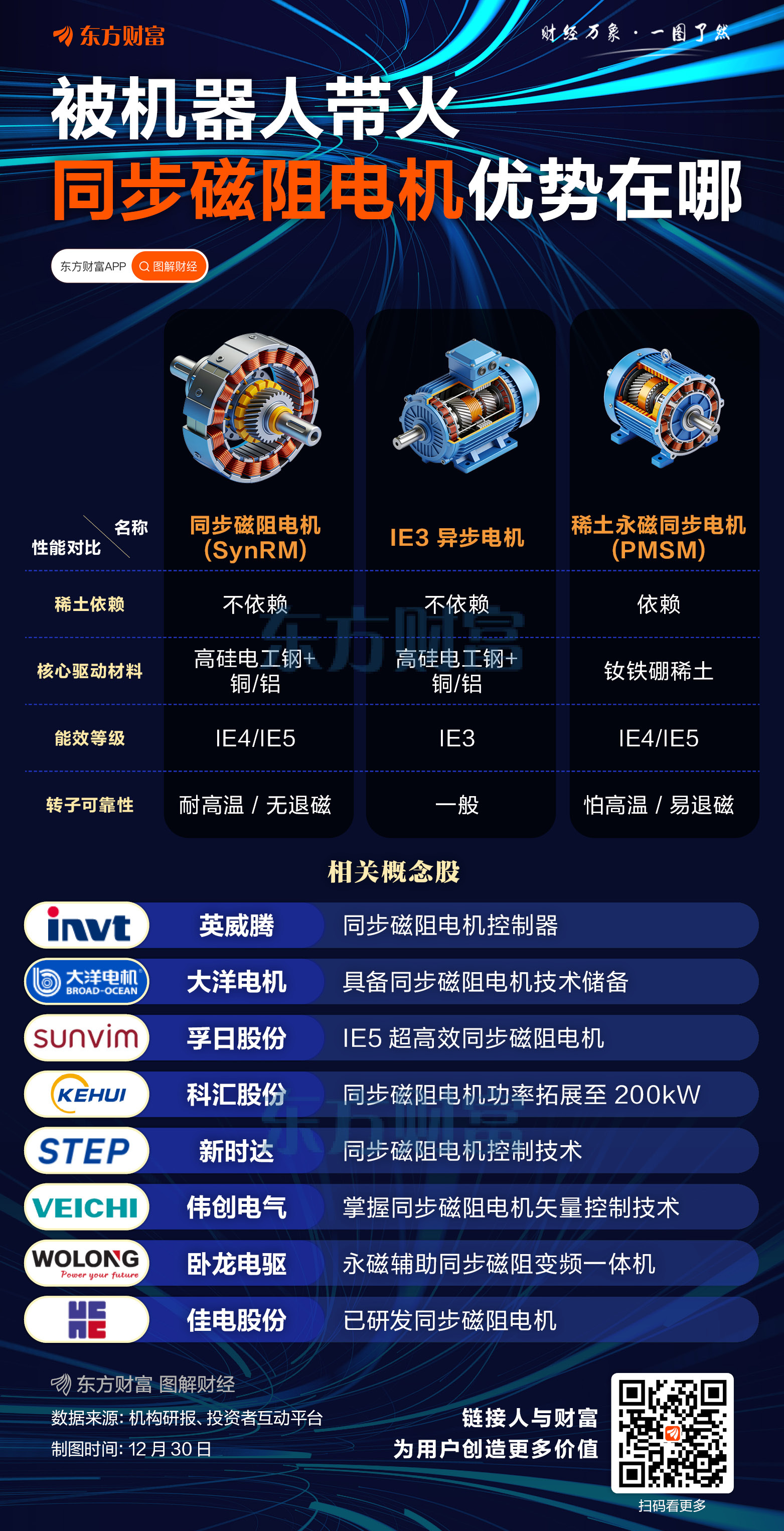 周二(12月30日)机器人概念爆发,其分支概念同步磁阻电机概念收盘也大涨超5%,伟创电气涨超10%,新时达涨停,卧龙电驱涨超7%,大洋电机、孚日股份涨超5%。