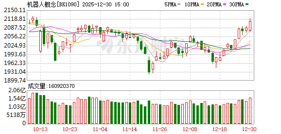 12月30日早上,开盘不到一个小时,机器人板块低开高走,突现涨停潮。其中,天铭科技30%涨停,五洲新春直线封板。截至午盘,涨停及涨幅超过10%的个股达到了18只。