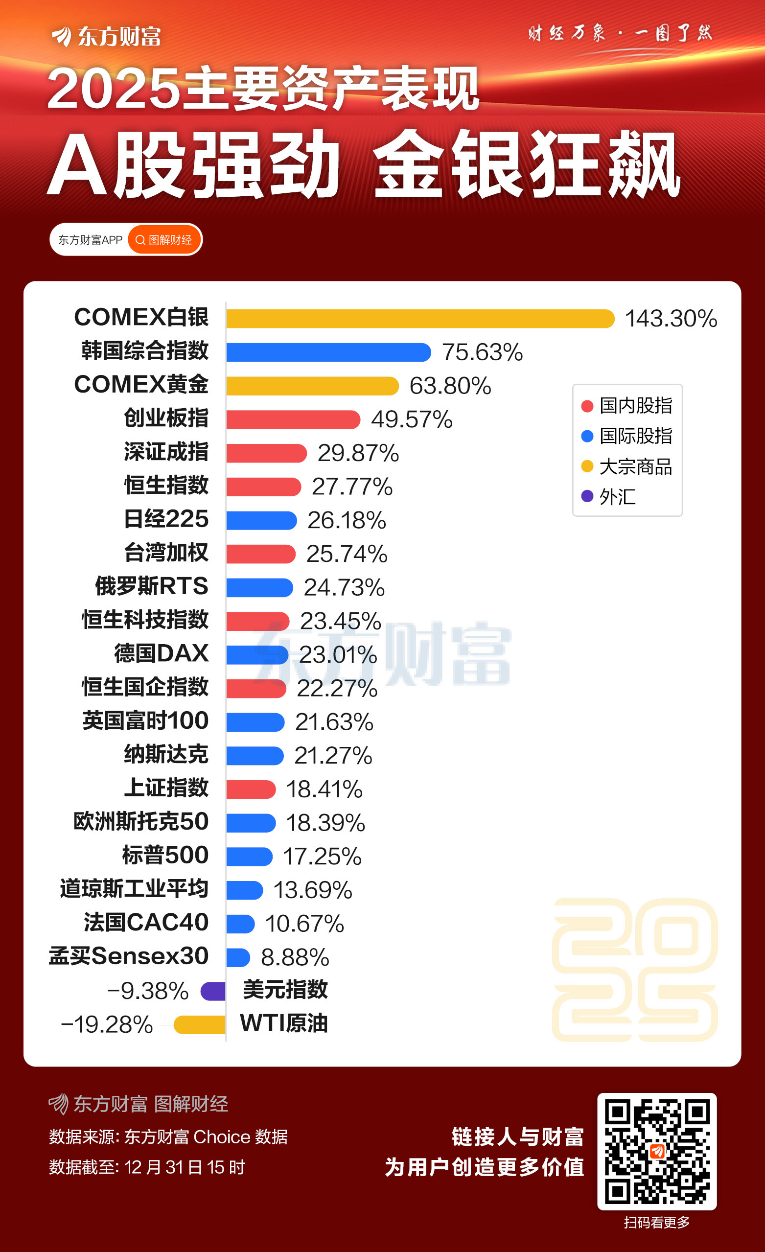 其他大类资产中,美元指数今年累计下跌9.38%,为2017年以来最差年度表现。大宗商品方面,贵金属年内走牛,白银今年暴涨143%,领涨全球主要资产,黄金也涨超63%;WTI原油大幅调整,今年跌超19%。(截至12月31日15时)