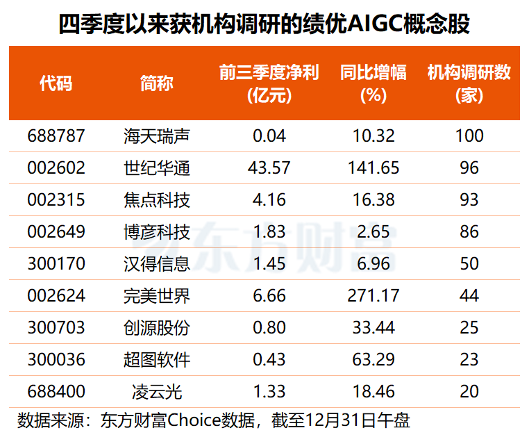 东方财富Choice数据显示,四季度以来,上述53只绩优AIGC概念股中,有13股获得机构关注。