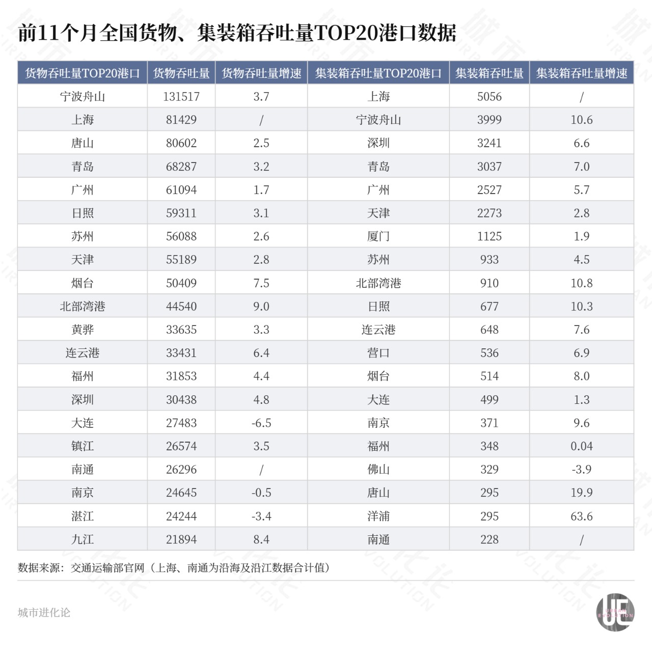 一般而言,货物吞吐量是指经港口进出并装卸的货物总量,集装箱吞吐量则是指港口进口和出口集装箱数量的总和,前者主要反映港口总体货物处理能力,后者更侧重于港口在国际物流中枢纽地位的强弱。