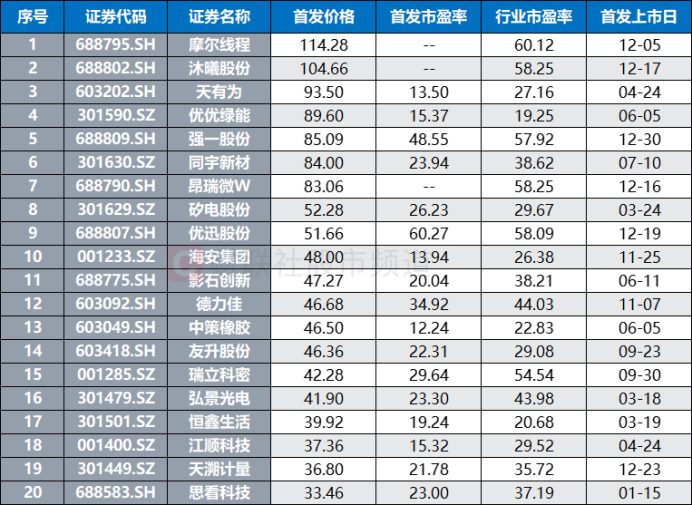 从发行数据上看,上市新股平均发行价达23.33元,中位数发行价17.09元。其中,摩尔线程、沐曦股份发行价唯二超百元,分别为114.28元、104.66元。天有为、优优绿能、强一股份、同宇新材、昂瑞微、矽电股份、优讯股份、海安集团、影石创新等股发行价格也较高,而华电新能、天工股份、赛分科技、浙江华远4股发行价不足5元。