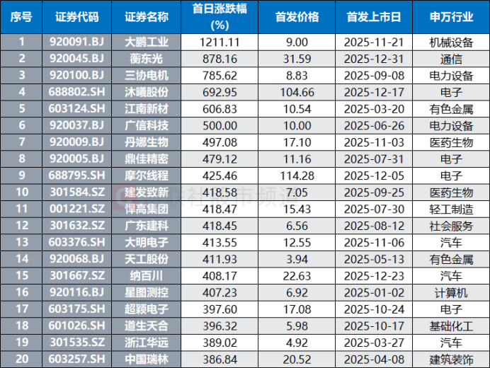 注:首日涨幅居前的2025年上市新股