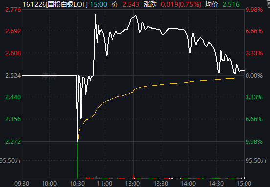 上午10:30,国投白银LOF复牌后出现大幅波动,直线跌停后又快速拉升,二十分钟左右逼近涨停,随后在6%的涨幅附近震荡。