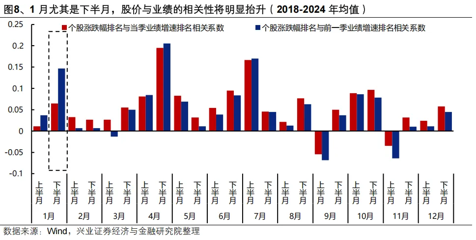 而随着上市公司年报业绩预告陆续披露,业绩将再度成为影响股价表现的主要因素。1月,尤其是下半月,随着上市公司年报预告陆续披露,股价与业绩的相关性将明显抬升,景气投资有效性增强,基本面验证下市场开始聚焦业绩确定性品种。而1月业绩预告披露落地后,2月市场再次迎来数据空窗期,直到3月上半月,股价表现与业绩的相关性都偏弱,市场进入预期和想象力主导的审美模式中,业绩验证不再成为股价表现的掣肘,这也是该阶段春季躁动行情具备弹性的重要原因。
