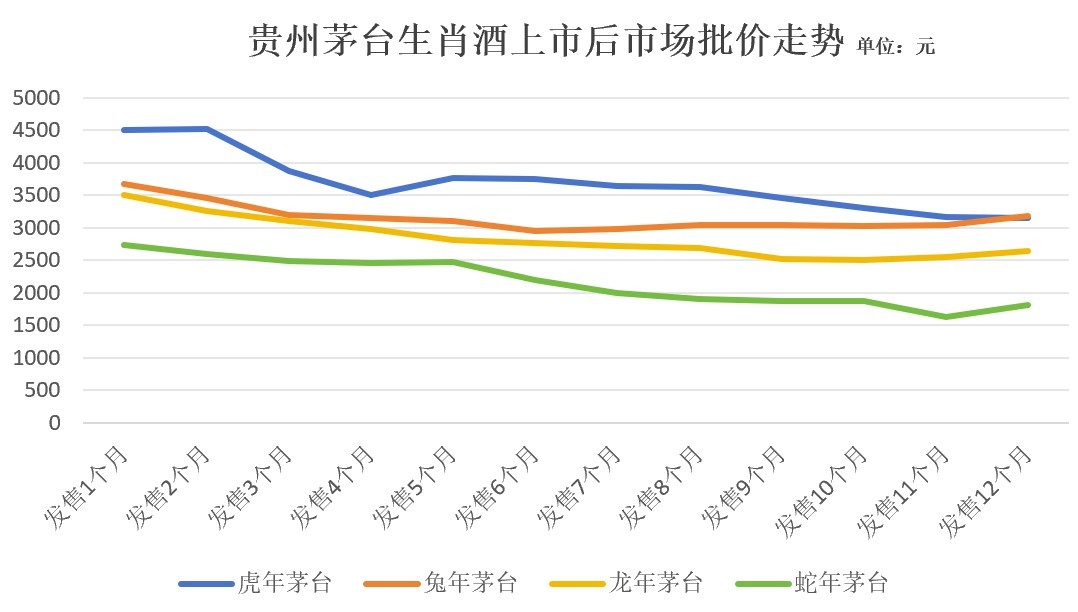 记者统计了解到,每年茅台生肖酒的发布,通常都会带动往年生肖系列产品的市场行情。记者统计近4年的生肖茅台酒价格走势发现,产品市场批发价均在上市时来到高点,一个月以后开始回落。