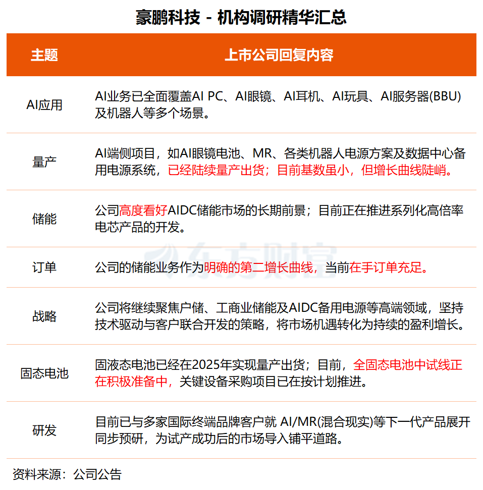 据悉,公司AI眼镜电池、MR、各类机器人电源方案以及数据中心备用电源系统已陆续量产出货。豪鹏科技表示,这些项目目前基数虽小,但增长曲线陡峭,代表未来的核心增量。