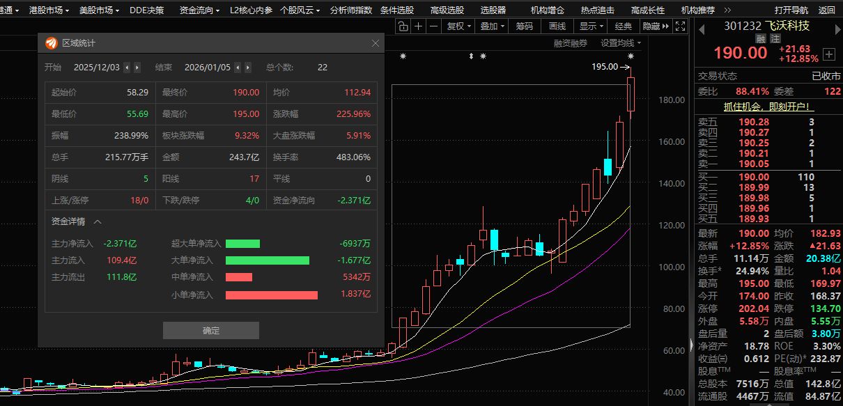 东方财富数据显示,2025年12月3日至2026年1月5日收盘,飞沃科技在22个交易日内累计大涨225.96%,期间总计成交额达243.7亿元,累计换手率达483.06%,相比之下,同期板块涨幅仅9.32%,大盘涨幅为5.91%。