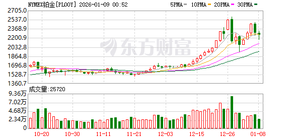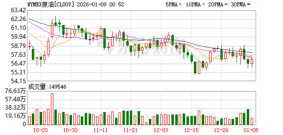 商品市场:COMEX黄金期货当月连续合约上涨54.20美元,涨幅1.22%,报4505.7美元/盎司。COMEX白银期货当月连续合约上涨4.563美元,涨幅5.95%,报81.22美元/盎司。现货白银上涨4.64美元,涨幅6.06%,报81.25美元/盎司。COMEX铂金期货当月连续合约上涨170.8美元,涨幅7.47%,报2456美元/盎司。COMEX钯金期货当月连续合约上涨126.4美元,涨幅7.16%,报1892美元/盎司。伦镍上涨1427美元,涨幅8.39%,报18430美元/吨。国际油价01月06日下跌。截至当天收盘,纽约商品交易所WTI原油期货当月连续合约下跌1.35美元,收于每桶56.97美元,跌幅为2.31%。