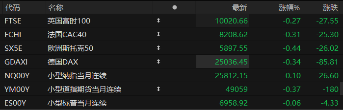 周四盘前,美股三大股指期货齐跌,欧洲主要指数普遍下跌。截至发稿,纳斯达克100指数期货跌0.10%,道指期货跌0.37%,标普500指数期货跌0.06%。
