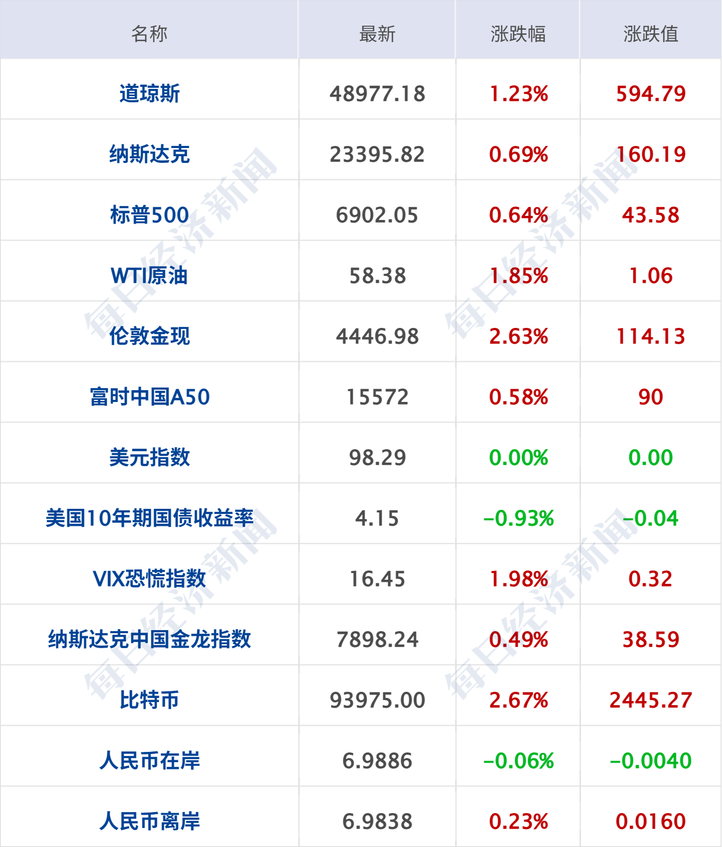 美股三大指数集体收涨,道指涨1.23%,再创历史新高;纳指涨0.69%,标普500指数涨0.64%。大型科技股多数上涨,特斯拉涨超3%,亚马逊涨逾2%,Meta涨超1%,奈飞、谷歌小幅上涨;苹果跌超1%,微软、英伟达、英特尔小幅下跌。热门中概股多数上涨,纳斯达克中国金龙指数涨0.49%。贝壳涨超6%,哔哩哔哩、腾讯音乐涨超3%,满帮、霸王茶姬等涨超2%,金山云、富途控股等涨超1%,唯品会、携程网等小幅上涨;蔚来跌超5%,万国数据、百胜中国跌超1%,小鹏汽车、新东方等跌超1%。