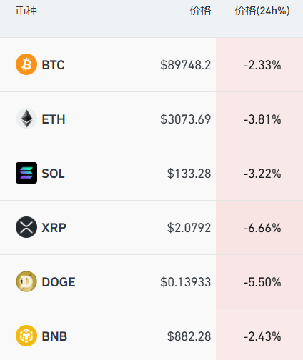 加密货币方面,主要币种集体下挫,比特币跌超2%,跌破90000美元关口。过去24小时,全市场超13万人爆仓。