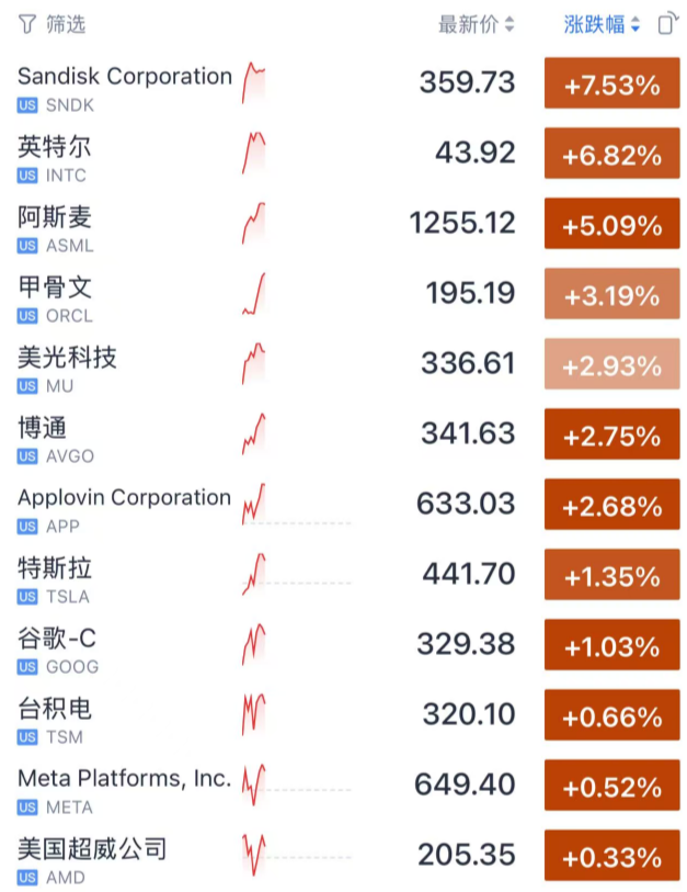存储芯片大涨,科技股普遍上涨。