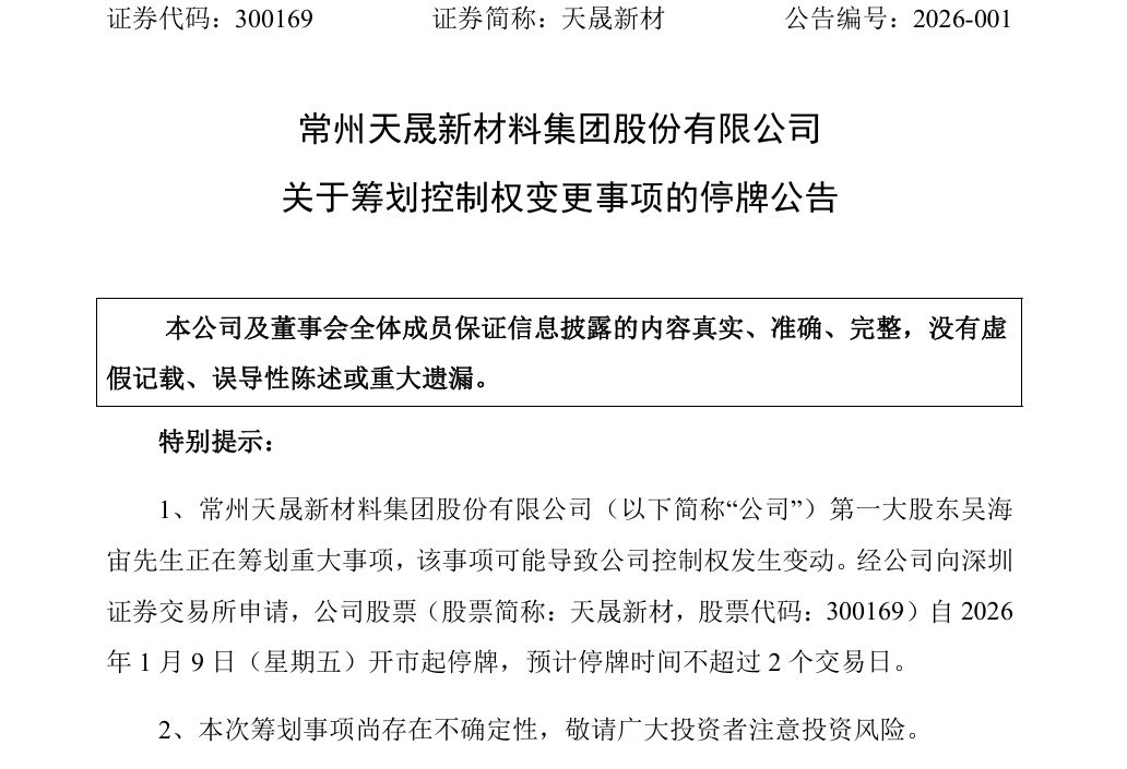 天晟新材:第一大股东筹划控制权变动