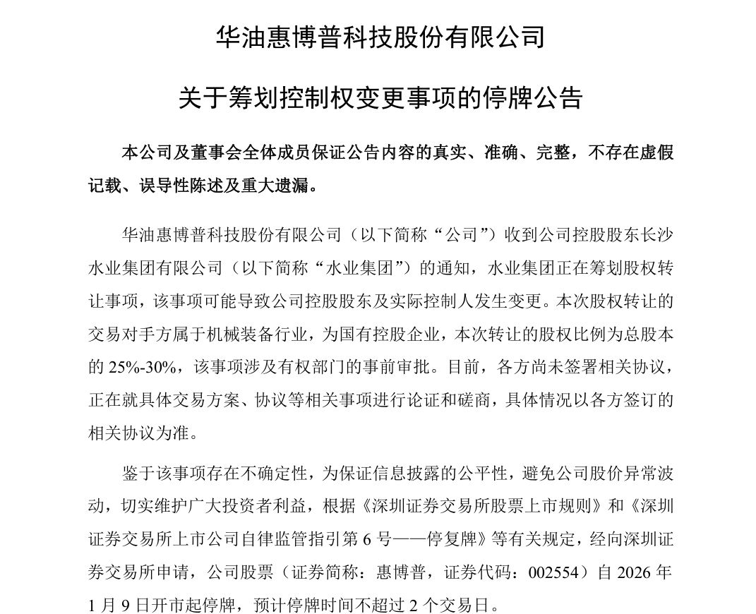 惠博普同日公告,收到控股股东长沙水业集团有限公司通知,水业集团正在筹划股权转让事项,可能导致公司控股股东及实际控制人发生变更。