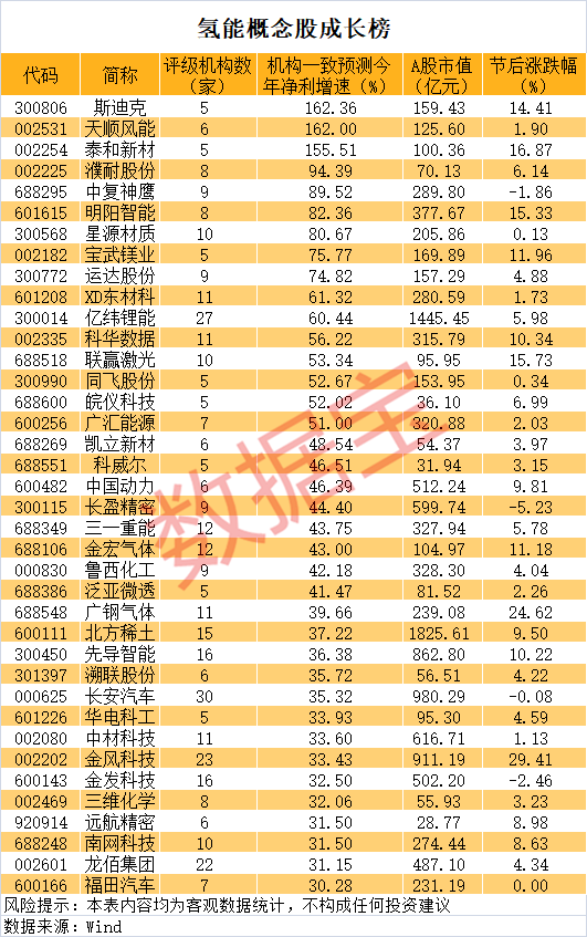 据证券时报·数据宝统计,A股市场上,氢能概念股合计有370多只。其中,阳光电源、长城汽车、宝丰能源、长安汽车等均有30家以上机构评级,银轮股份、亿纬锂能、卫星化学、紫金矿业等均有10家以上机构评级。