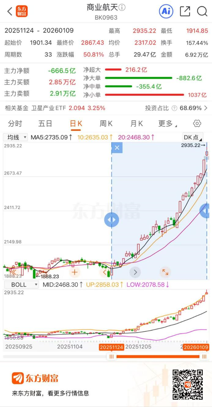 1月9日,商业航天概念继续走高,截至早间收盘,板块大涨2.24%,日K线已6连阳。个股方面,信科移动-U 20CM涨停,邵阳液压、国科军工、震有科技、上海瀚讯、富士达、蓝思科技、星环科技-U、亚信安全、泰胜风能等涨超10%,杭萧钢构、旭升集团、巨力索具、中衡设计、国机精工、云南锗业、江顺科技、东方钽业、安泰科技、神开股份、中国一重等多股涨停。