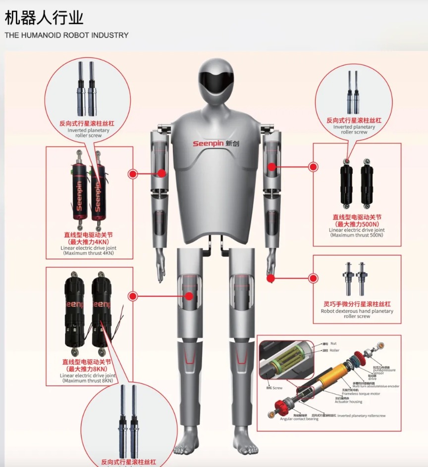 行星滚柱丝杠被视为人形机器人的“关节”与“肌腱”,用于实现旋转与直线运动的转换。其应用于人形机器人关节驱动和运动控制,如手臂、腿部以及灵巧手等,是实现精准移动和稳定支撑的重要部件。