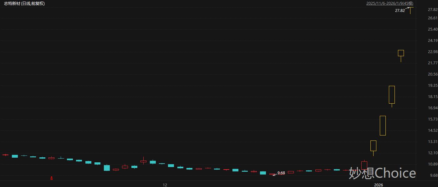 志特新材是2026年第一周首只翻倍股,该股全周连收5个20CM涨停板。拉长时间来看,志特新材股价自2025年12月低点迄今累计最大涨幅187%。数据显示,志特新材集AI应用、机器人、量子科技等热门概念于一身。消息面上,近日被称之为“科技春晚”的《中国科技创新盛典》正式播出,志特新材代理的防火隔热材料产品在节目中亮相。1月8日,志特新材在互动平台表示,公司代理的防火隔热材料产品目前仍处于实验室研发优化阶段,暂未达到量产条件,尚未产生相关营业收入。财通证券分析师陈悦明10月30日研报认为,志特新材铝模主业在国内与海外市场均不断突破。上半年公司布局“AIforScience+量子计算”研发新材料,当前已有隔热产品从市场反馈来看,客户对其性能优势及成本竞争力给予了肯定。