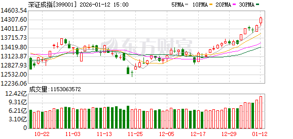 A股三大指数今日继续强势表现,沪指日线17连阳再创逾十年新高。截止收盘,沪指涨1.09%,收报4165.29点;深证成指涨1.75%,收报14366.91点;创业板指涨1.82%,收报3388.34点。沪深京三市成交额达到36450亿,较上一交易日大幅放量近5000亿,创A股历史最大成交量。