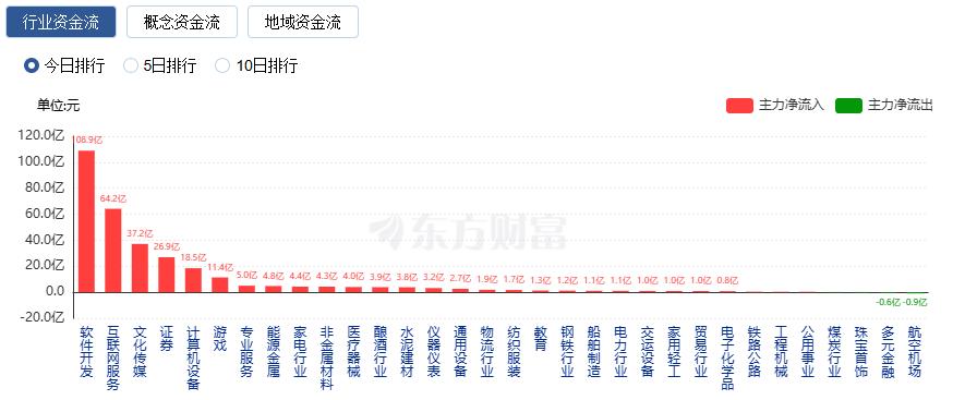 行业资金方面,截至收盘,软件开发、互联网服务、文化传媒等净流入排名靠前,其中软件开发净流入108.9亿。