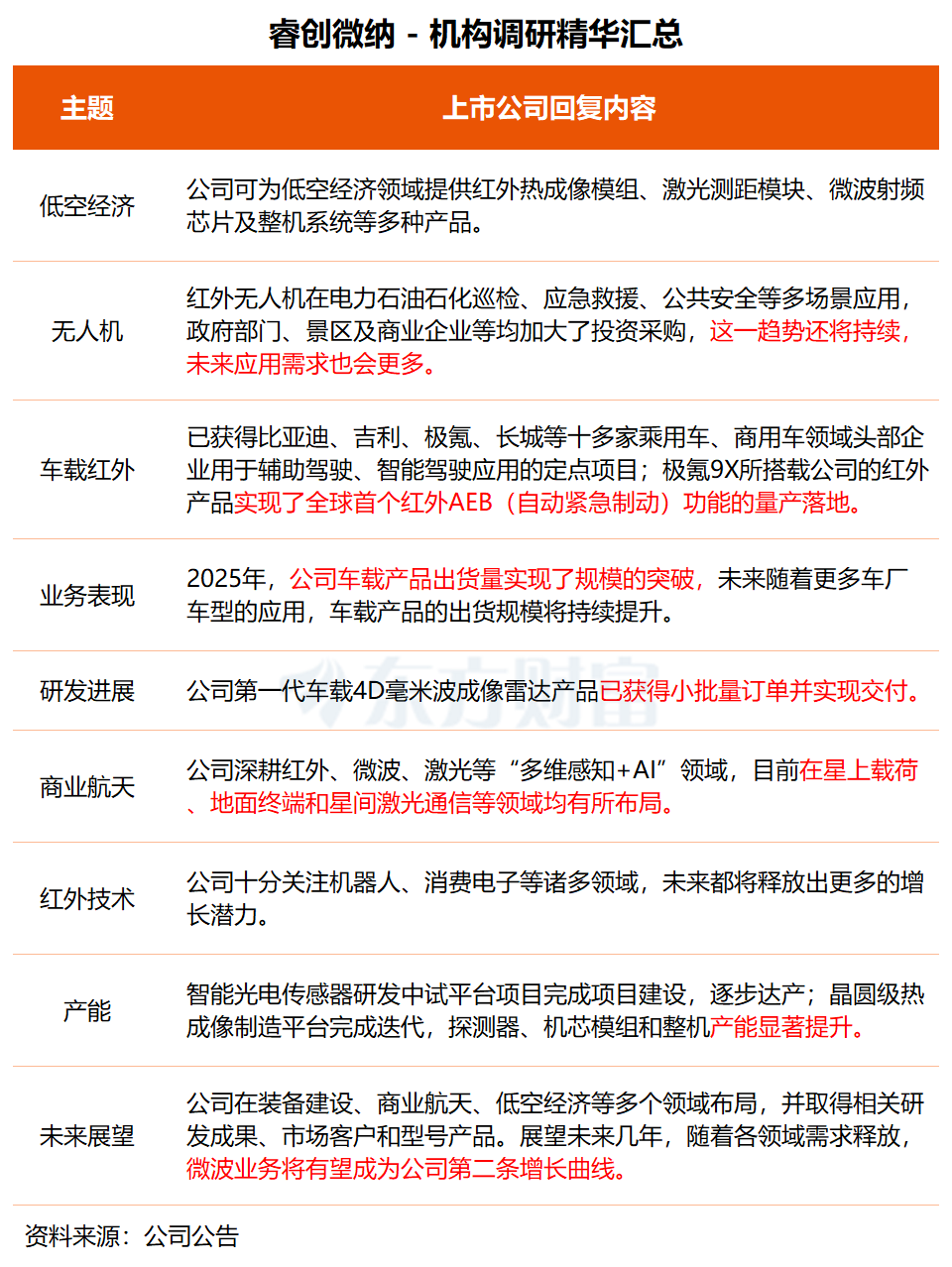 在商业航天领域,睿创微纳称,公司深耕红外、微波、激光等“多维感知+AI”领域,目前在星上载荷、地面终端和星间激光通信等领域均有所布局。